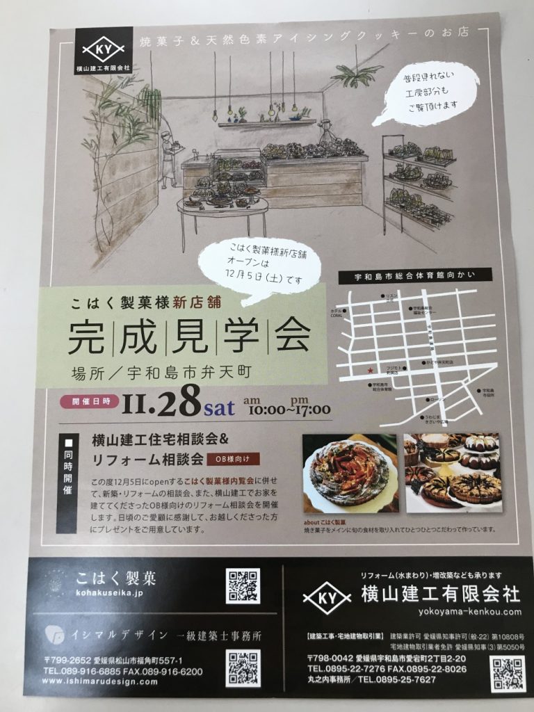 こはく製菓様完成見学会のお知らせ 2020.11.26 こはく製菓様新店舗の完成見学会のお知らせです。 11月28日土曜日 10時から17時まで 完成見学会&住宅相談会をします。 ぜひお越しください。 « 前の記事へ │HOME│ 次の記事へ »