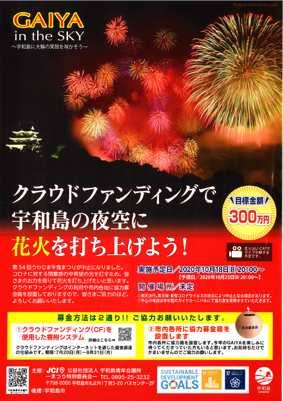 新型コロナウイルスで暗い世の中に皆様の力で大きな光を灯し、未来の宇和島市に繋げていくための花火大会を開催するとのことです。